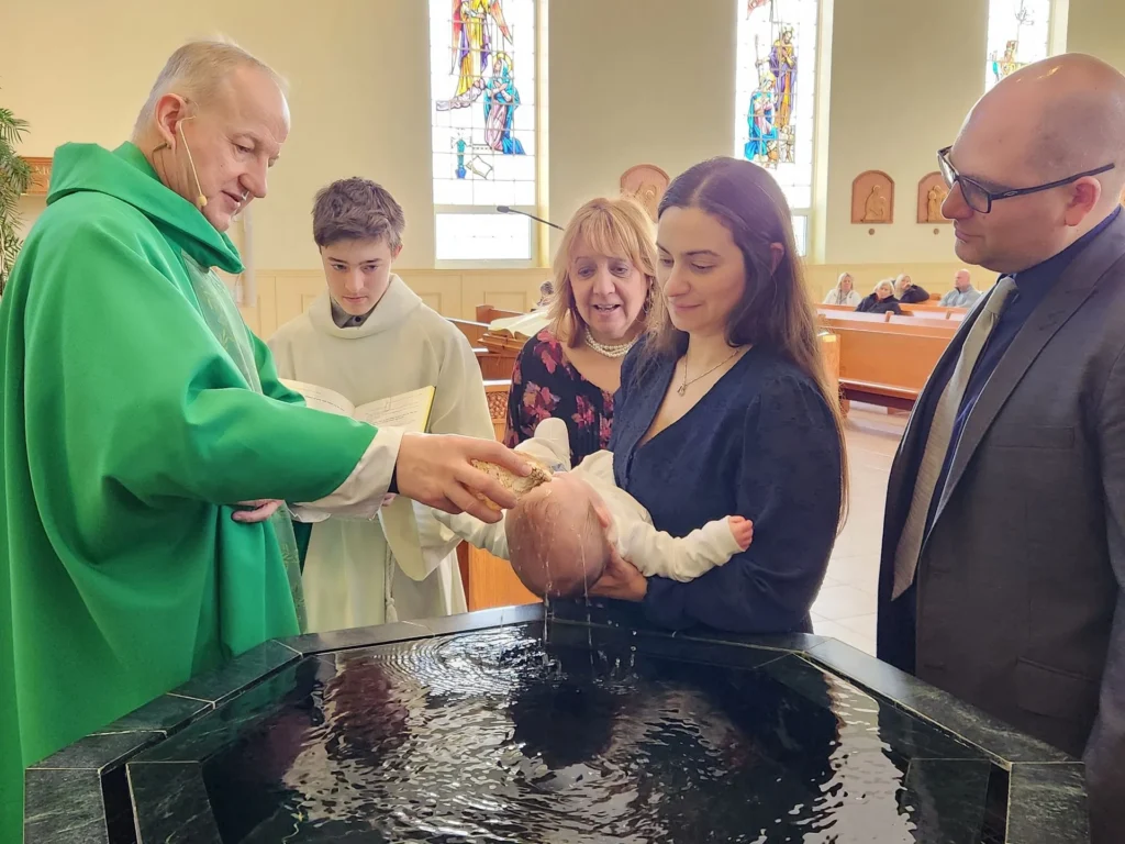 Through the simple but profound act of water being poured over the child’s head (or immersion in water), and the invocation of the Holy Trinity—”I baptize you in the name of the Father, and of the Son, and of the Holy Spirit”—the child is united with Jesus Christ. (Catechism of the Catholic Church 977, 1213ff; 1275 1278) In this moment, we are reminded of Christ’s death and resurrection, which brought forgiveness of our sins and opened the gates to everlasting life. Baptism is not just a personal gift—it is a celebration of the entire faith community.
